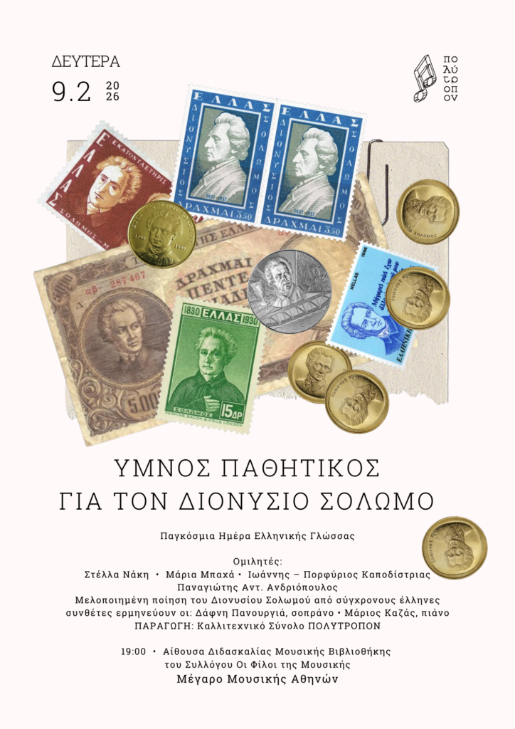 Το Καλλιτεχνικό Σύνολο «Πολύτροπον» παρουσιάζει στις 9 Φεβρουαρίου 2026 στο Μέγαρο Μουσικής την εκδήλωση «Ύμνος Παθητικός για τον Διονύσιο Σολωμό», αφιερωμένη στην Παγκόσμια Ημέρα Ελληνικής Γλώσσας. (Δελτίο Τύπου: Καλλιτεχνικό Σύνολο «Πολύτροπον»)