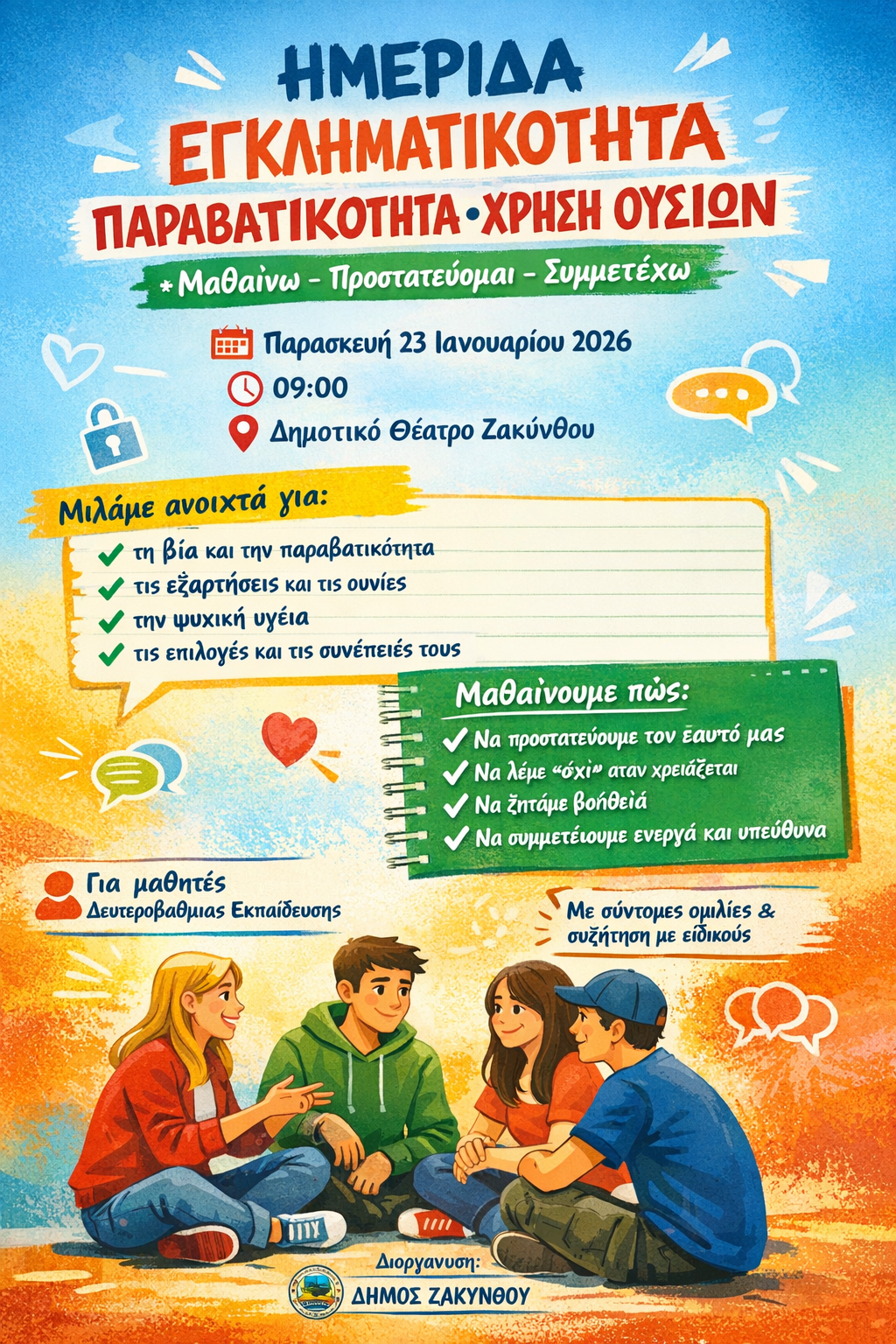 Ο Δήμος Ζακύνθου διοργανώνει στις 23 Ιανουαρίου 2026 ημερίδα στο Δημοτικό Θέατρο για την πρόληψη εγκληματικότητας και ουσιών, με τη συμμετοχή φορέων και ειδικών, στοχεύοντας στην ενημέρωση και ενδυνάμωση των μαθητών.[...]