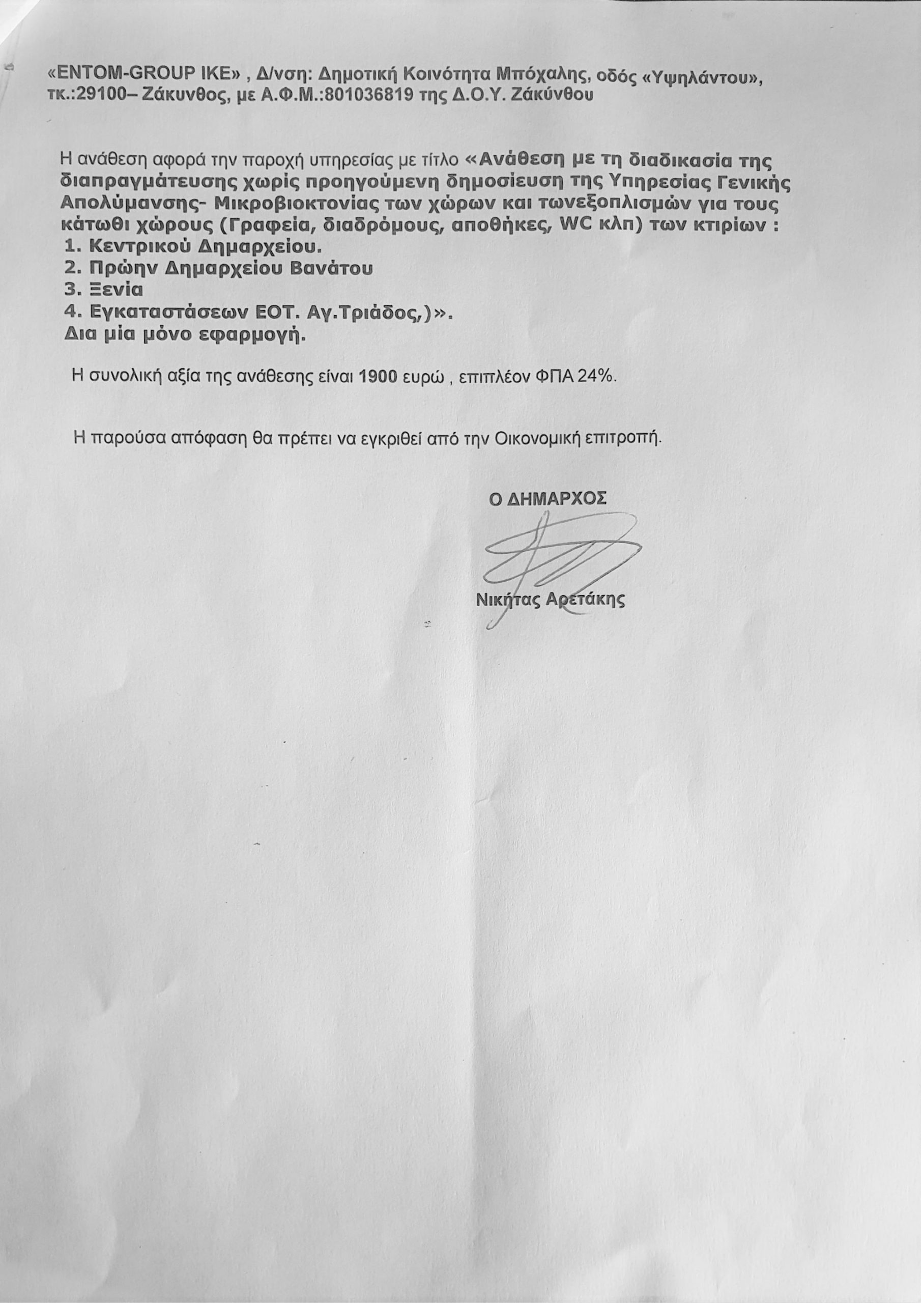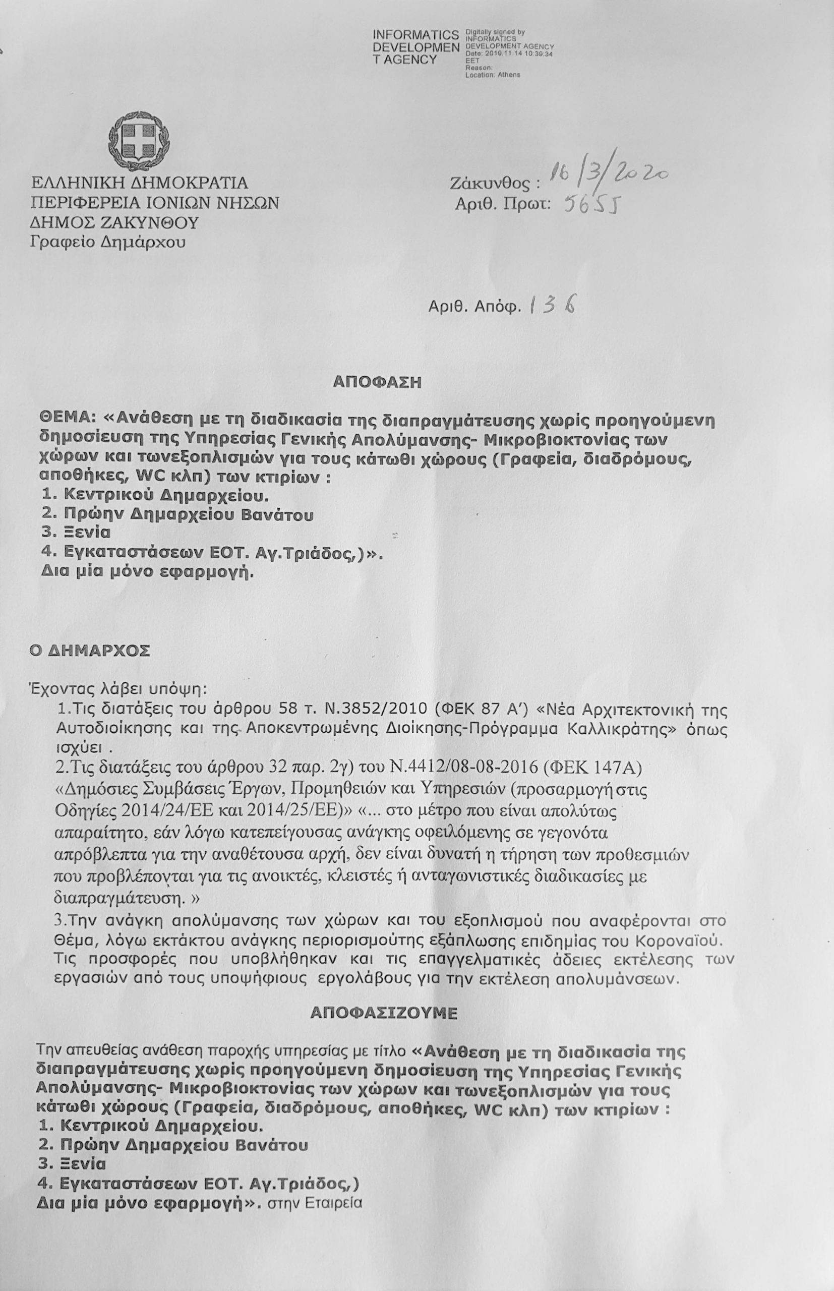 «Δεν έχει γίνει καμιά προμήθεια στο δήμο. Κατά τα λοιπά, σήμερα αποφάσισε ο Δήμαρχος να γίνει απολύμανση στα τέσσερα δημοτικά κτήρια που στεγάζουν δημοτικές υπηρεσίες, κάνοντας απευθείας ανάθεση σε ιδιωτική εταιρεία, Η απολύμανση για αυτά τα δημοτικά κτήρια, στοιχίζει 1.900 ευρώ. Το αναφέρω αυτό επειδή κάποιοι «δημοσιογράφοι» ρωτούσαν τον Δήμαρχο, ποιος τον «σπρώχνει» σε μεγάλα έξοδα, ανάφεραν το όνομά μου, και μιλούσαν για ποσά των 30, 40 ή και 50 χιλιάδων ευρώ, τους λέω ότι είναι ηλίθιοι.