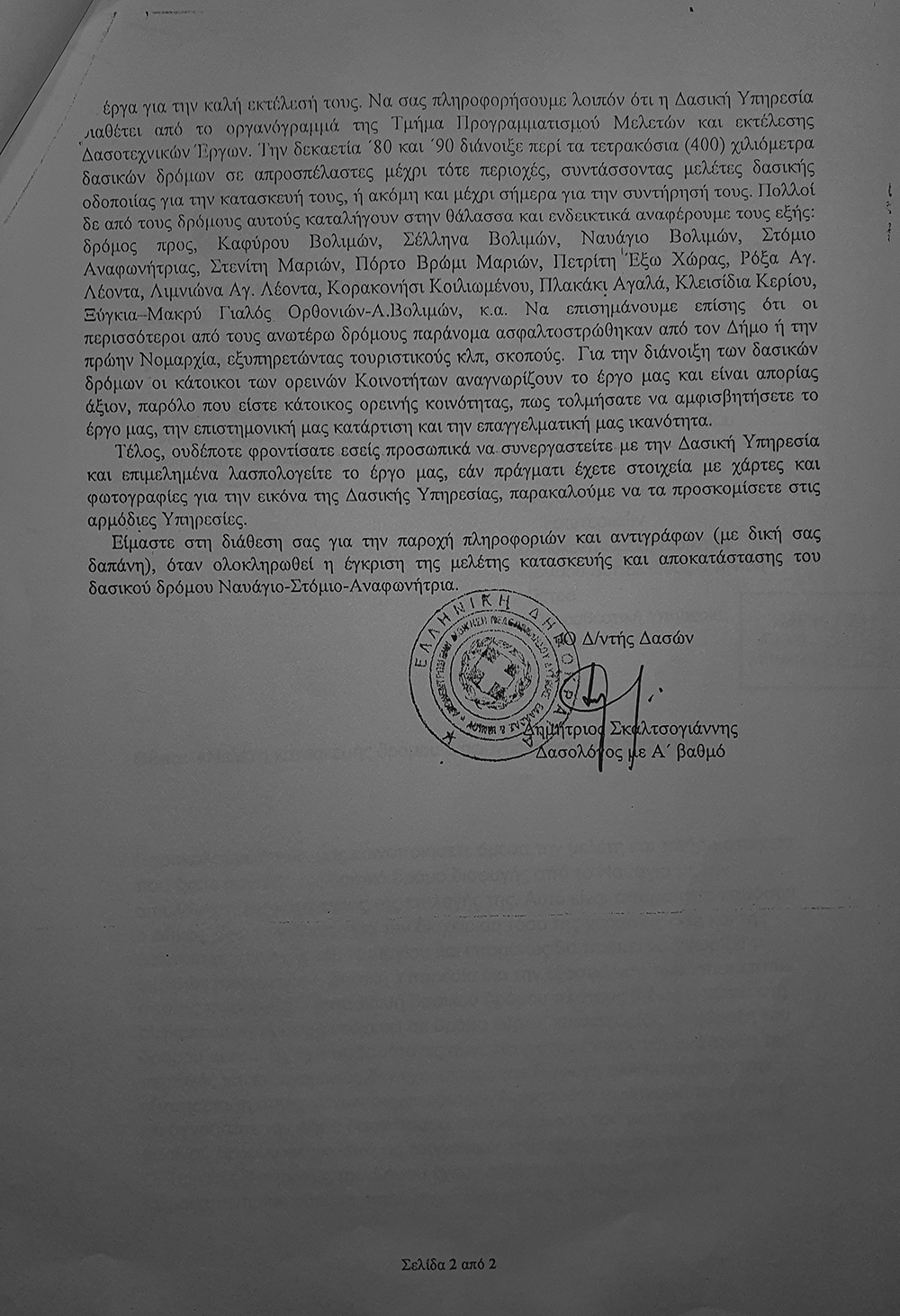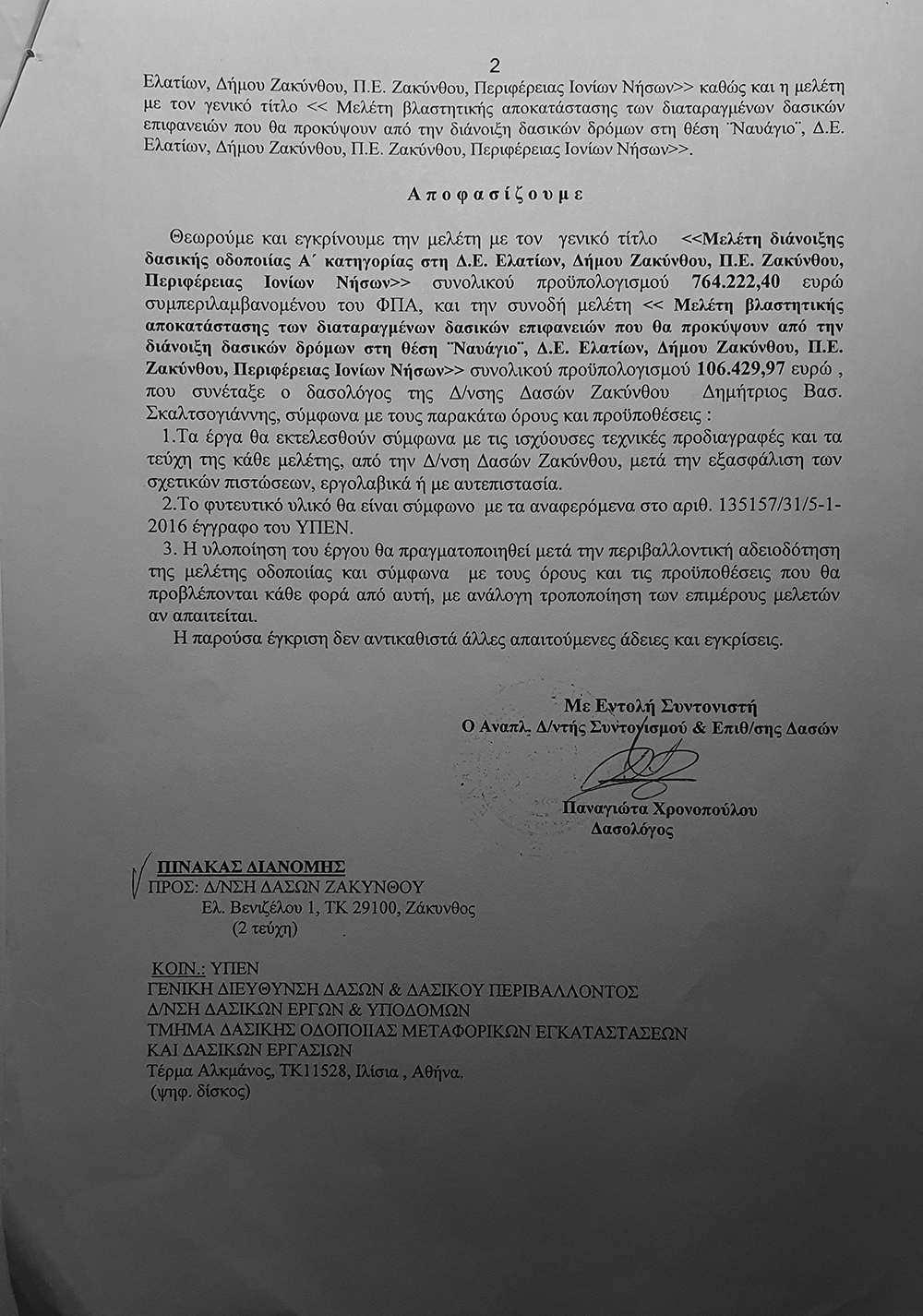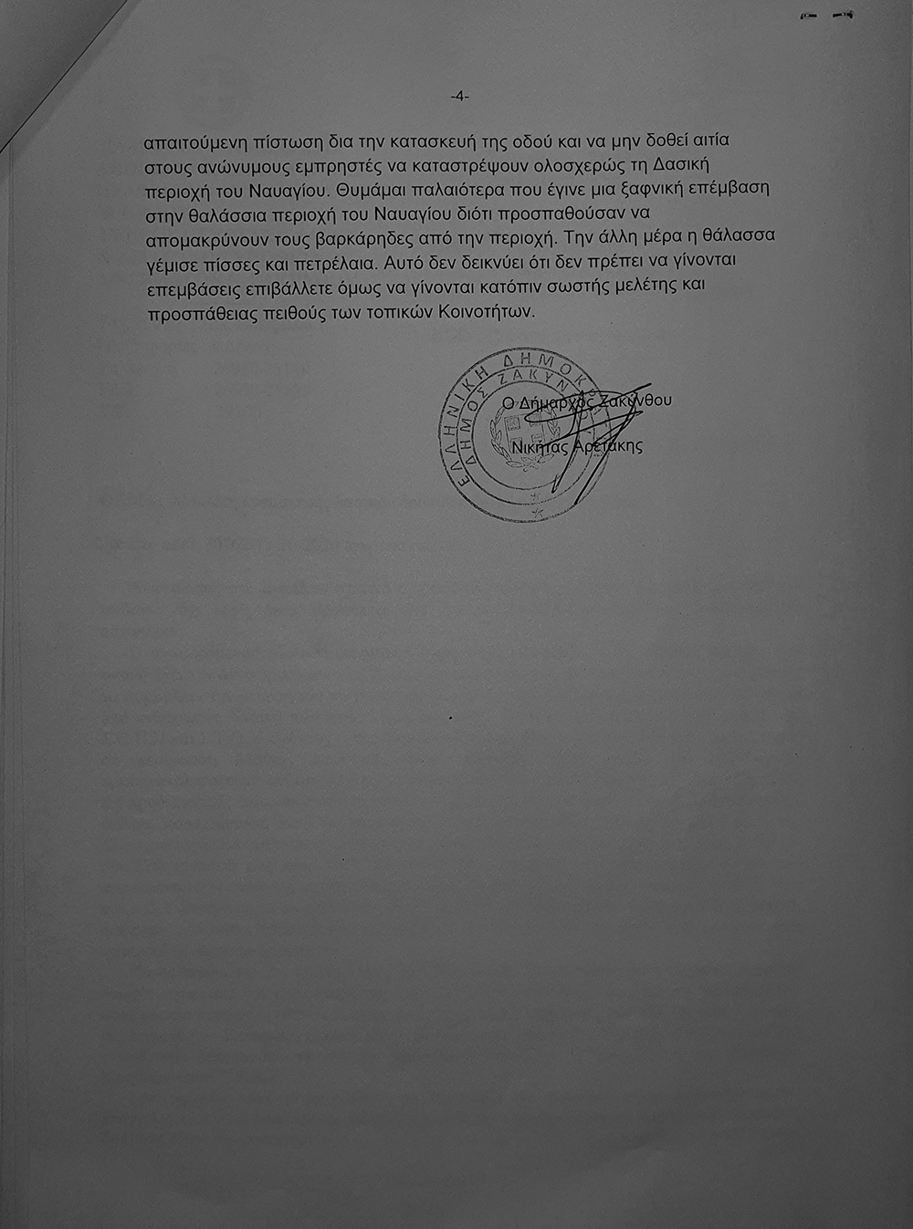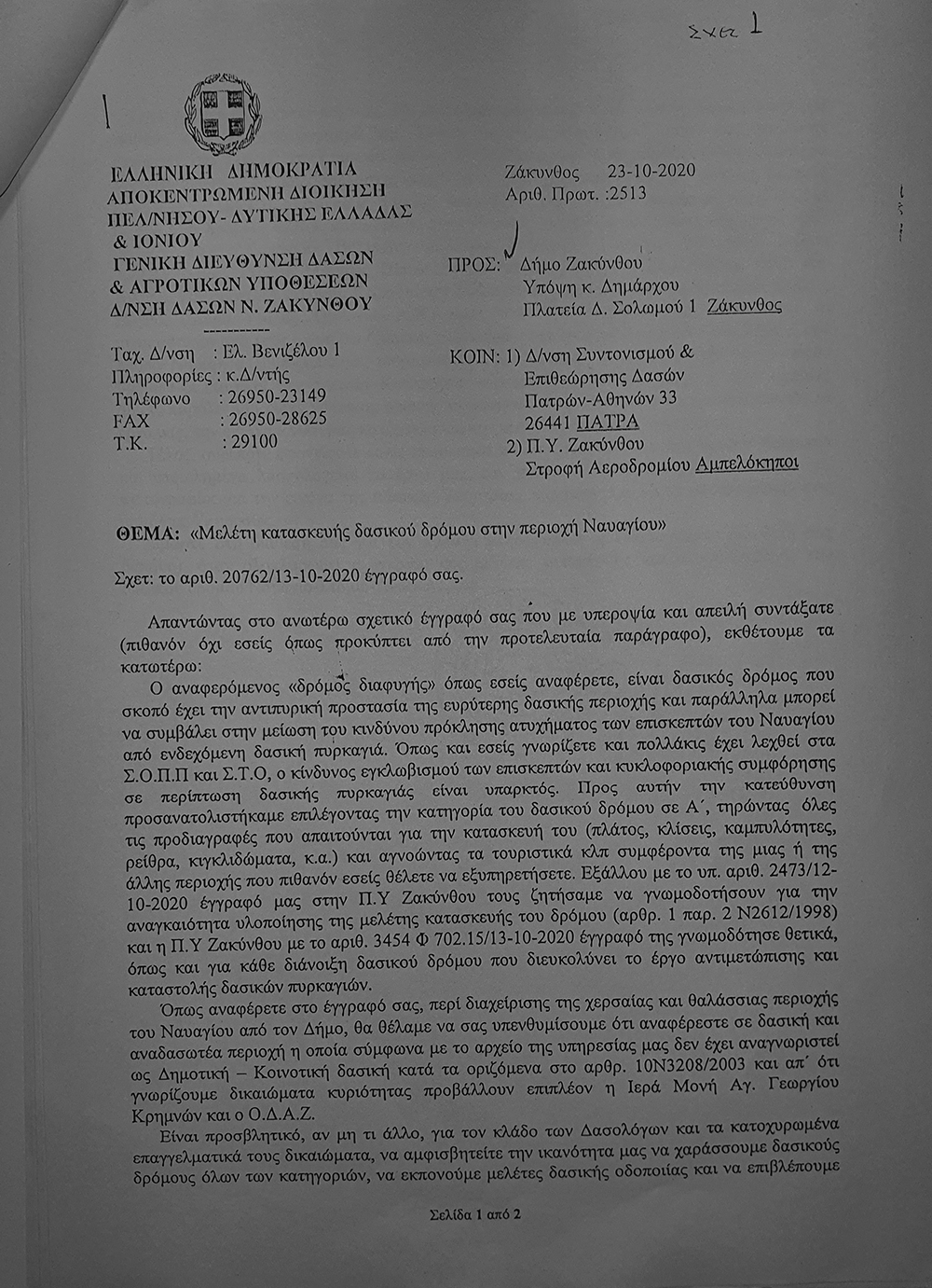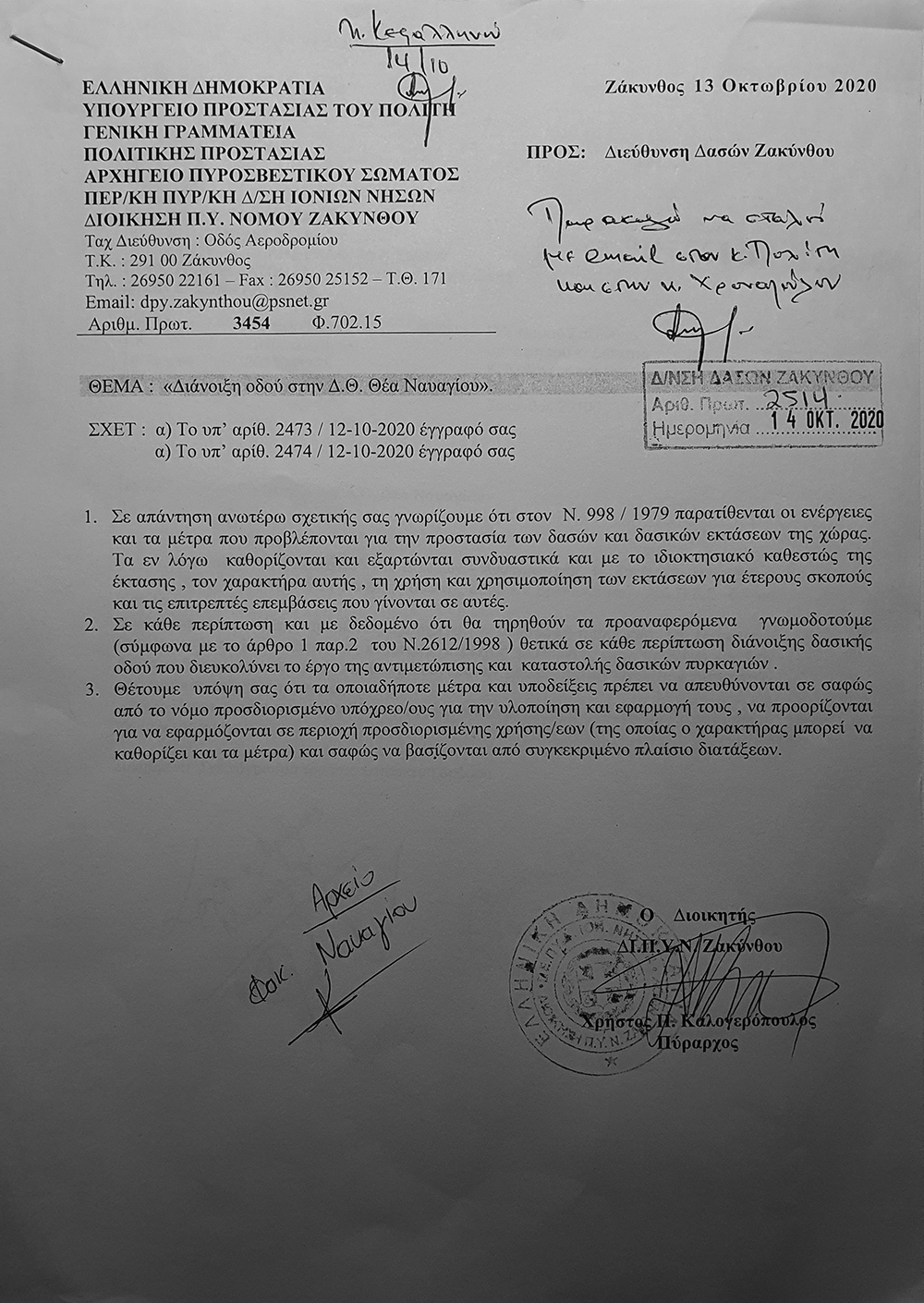 Στην περιοχή του Ναυαγίου έχουμε ανάγκη έναν δρόμο που πρέπει να εξυπηρετεί την αντιπυρική προστασία της ευρύτερης περιοχής αλλά και την μείωση του κινδύνου των επισκεπτών από τυχόν πυρκαγιά στην περιοχή. Ο δρόμος αυτός πρέπει να έχει μία διαφορετική κατεύθυνση από αυτή προς τον βορρά που έχει ο υφιστάμενος δρόμος. Υπάρχει ήδη ένας δρόμος με νότια κατεύθυνση, από την Αναφωνήτρια προς το Στόμιο του Ναυαγίου, που χρονολογείται από το 1998 ο οποίος δεν ολοκληρώθηκε ποτέ. Λέμε λοιπόν ότι αυτός ο δρόμος, πρέπει να ολοκληρωθεί από το Στόμιο μέχρι και το αδιέξοδο του Ναυαγίου. Αν κατασκευάζαμε δρόμο Γ’ κατηγορίας δεν θα πληρούσε όλες τις απαιτούμενες προαναφερθείσες προδιαγραφές. Η μελέτη που καταθέσαμε αφορά την κατασκευή ενός δασικού δρόμου Α’ κατηγορίας συνολικού προϋπολογισμού 764.000€. Για την κατασκευή αυτού του δρόμου συμφωνεί η Περιφέρεια και η Πυροσβεστική Υπηρεσία. Επαναλαμβάνω ότι μιλάμε για δρόμο που θα εξυπηρετήσει 4 χιλιάδες κόσμο στο Ναυάγιο, ΙΧ και λεωφορεία. Εμείς κάναμε το χρέος μας, ολοκληρώσαμε την μελέτη η οποία εγκρίθηκε και τώρα θα δούμε αν θα χρηματοδοτηθεί για να υλοποιηθεί το έργο.