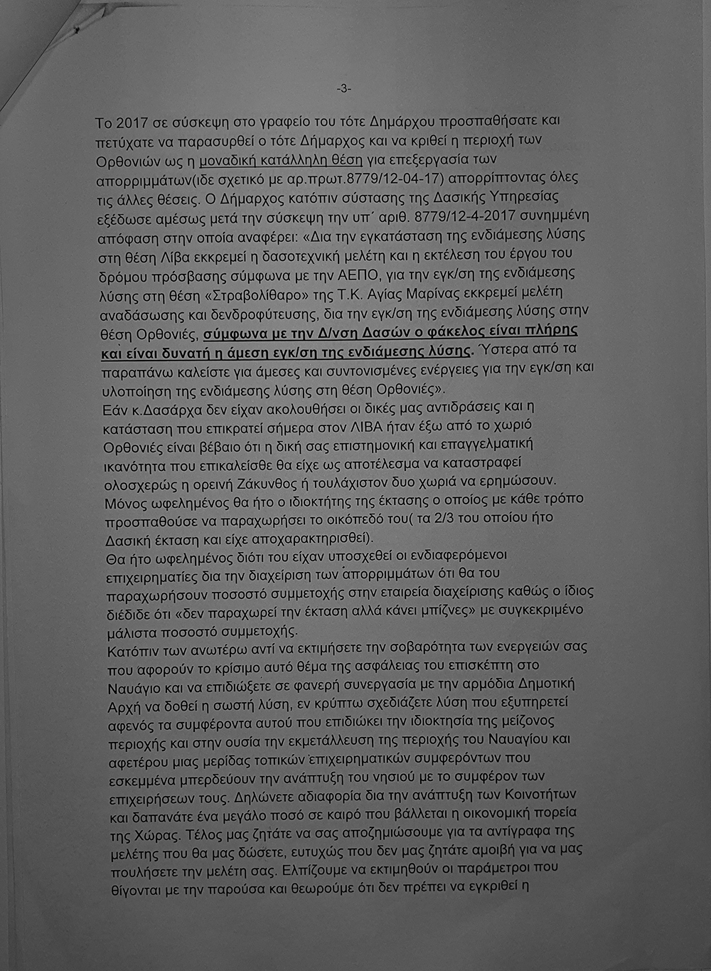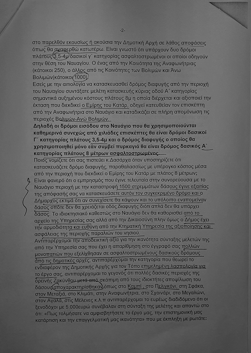 Ως προϊστάμενος, έκανα όλες τις απαιτούμενες ενέργειες για να μην βιώσουμε στο Ναυάγιο τραγωδία όπως στο Μάτι, ή και χειρότερα ακόμα. Όποιος νομίζει ότι μπορεί να φτιάξει άλλη μελέτη για διάνοιξη δρόμου διαφυγής, να την καταθέσει και να την υλοποιήσει, ας το κάνει.