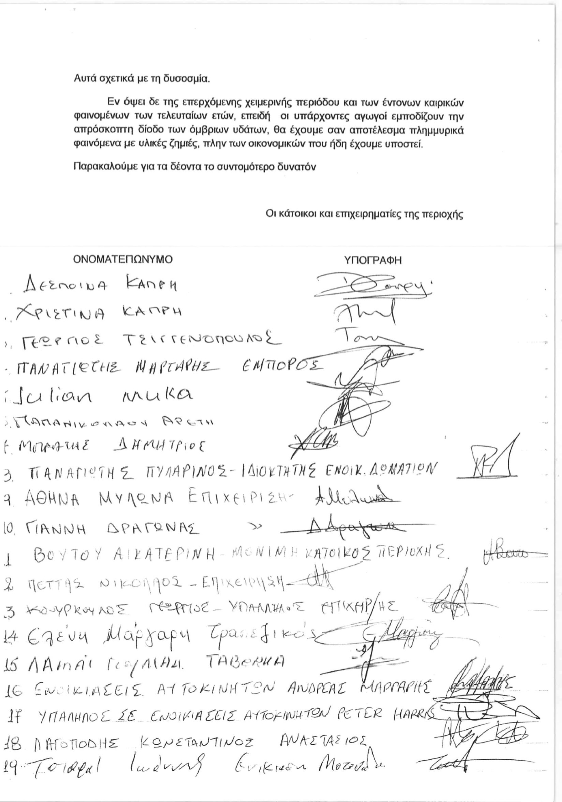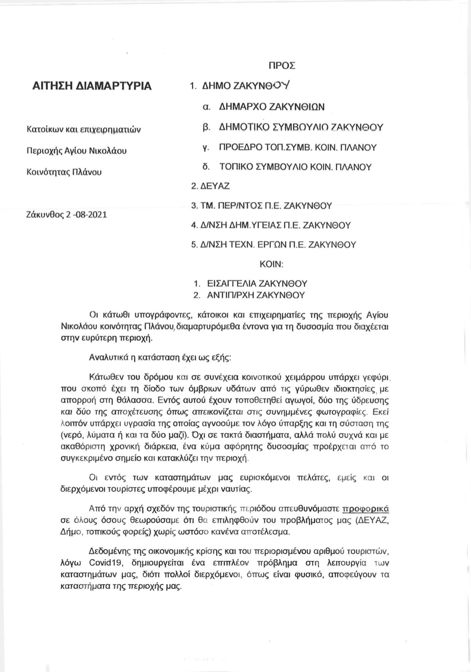 Συντάξαμε αίτηση διαμαρτυρίας που συνυπογράφουν 35 κάτοικοι και επιχειρηματίες αποκλειστικά της περιοχής μας, που αγωνιούν για την κατάσταση που επικρατεί. Την στείλαμε στον Δήμαρχο, στη ΔΕΥΑΖ, στο Δημοτικό Συμβούλιο, στο Τοπικό Συμβούλιο Πλάνου, στο Υπουργείο Περιβάλλοντος, στη Διεύθυνση Δημόσιας Υγείας, στη Διεύθυνση Δημόσιας Περιβάλλοντος, στη Διεύθυνση Τεχνικών Υπηρεσιών, στην Εισαγγελέα και στον Αντιπεριφερειάρχη Ζακύνθου, σε όλες τις αρμόδιες αρχές και υπηρεσίες. Δεν θα σταματήσουμε εδώ, είμαστε αποφασισμένοι ότι αν δεν βρεθεί λύση θα πάμε στα δικαστήρια.»